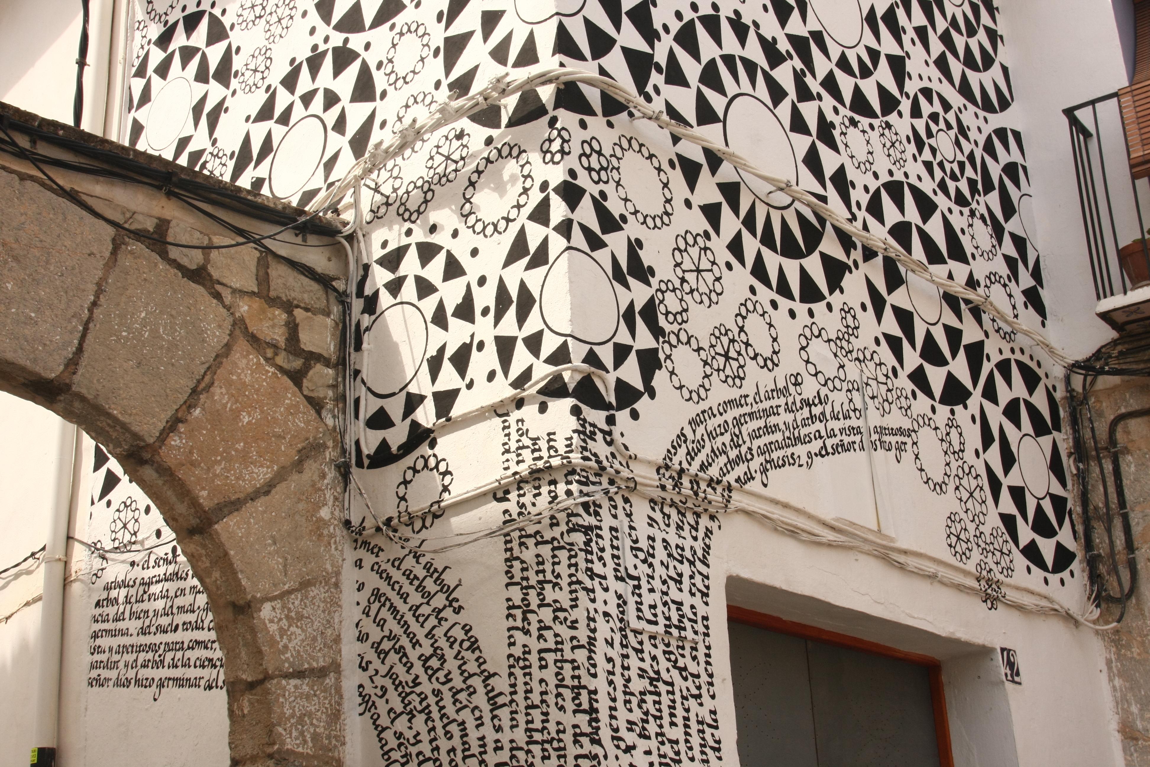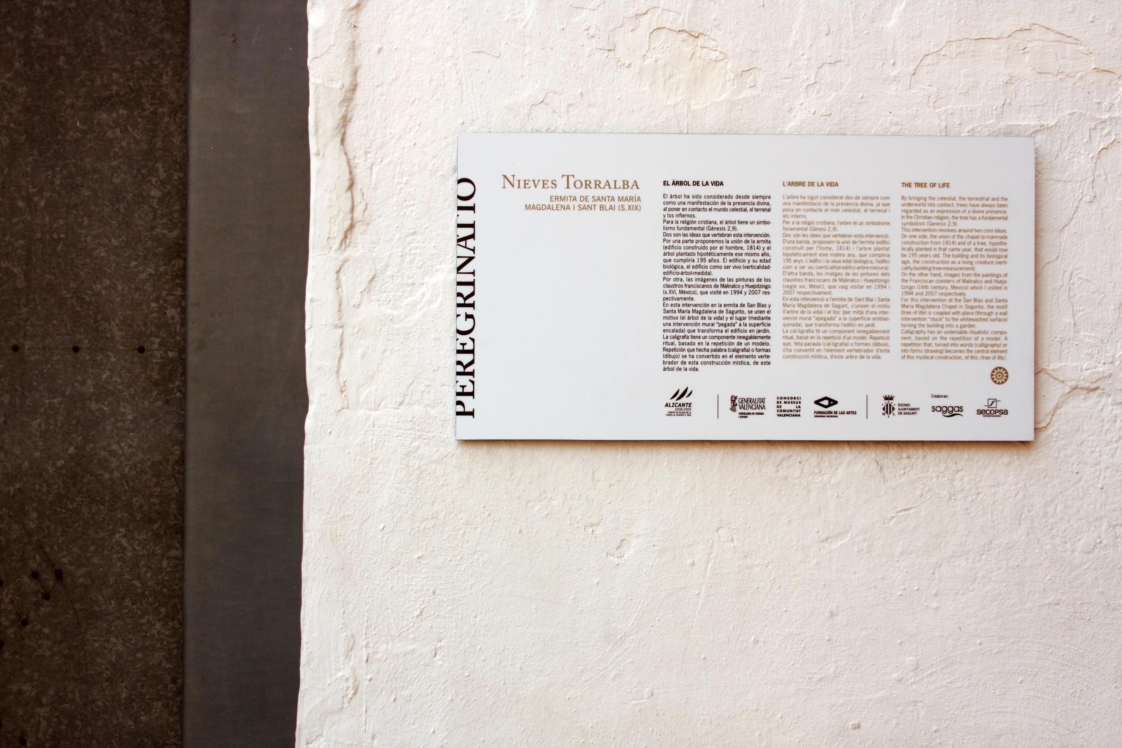 El árbol ha sido considerado desde siempre como una manifestación de la presencia divina, al poner en contacto el mundo celestial, el terrenal y los infiernos.Para la religión cristiana, el árbol tiene un simbolismo fundamental (Génesis 2,9).Dos son las ideas que vertebran esta intervención. Por una parte proponemos la unión de la ermita (edificio construido por el hombre, 1814) y el árbol plantado hipotéticamente ese mismo año, que cumpliría 195 años. El edificio y su edad biológica, el edificio como ser vivo (verticalidad-edificio-árbol-medida)Por otra, las imágenes de las pinturas de los claustros franciscanos de Malinalco y Huejotzingo (s.XVI, México), que visité en 1994 y 2007 respectivamente.En esta intervención en la ermita de San Blas y Santa María Magdalena de Sagunto, se unen el motivo (el árbol de la vida) y el lugar (mediante una intervención mural “pegada” a la superficie encalada) que transforma el edificio en jardín.La caligrafía tiene un componente innegablemente ritual, basado en la repetición de un modelo. Repetición que hecha palabra (caligrafía) o formas (dibujo) se ha convertido en el elemento vertebrador de esta construcción mística, de este árbol de la vida.