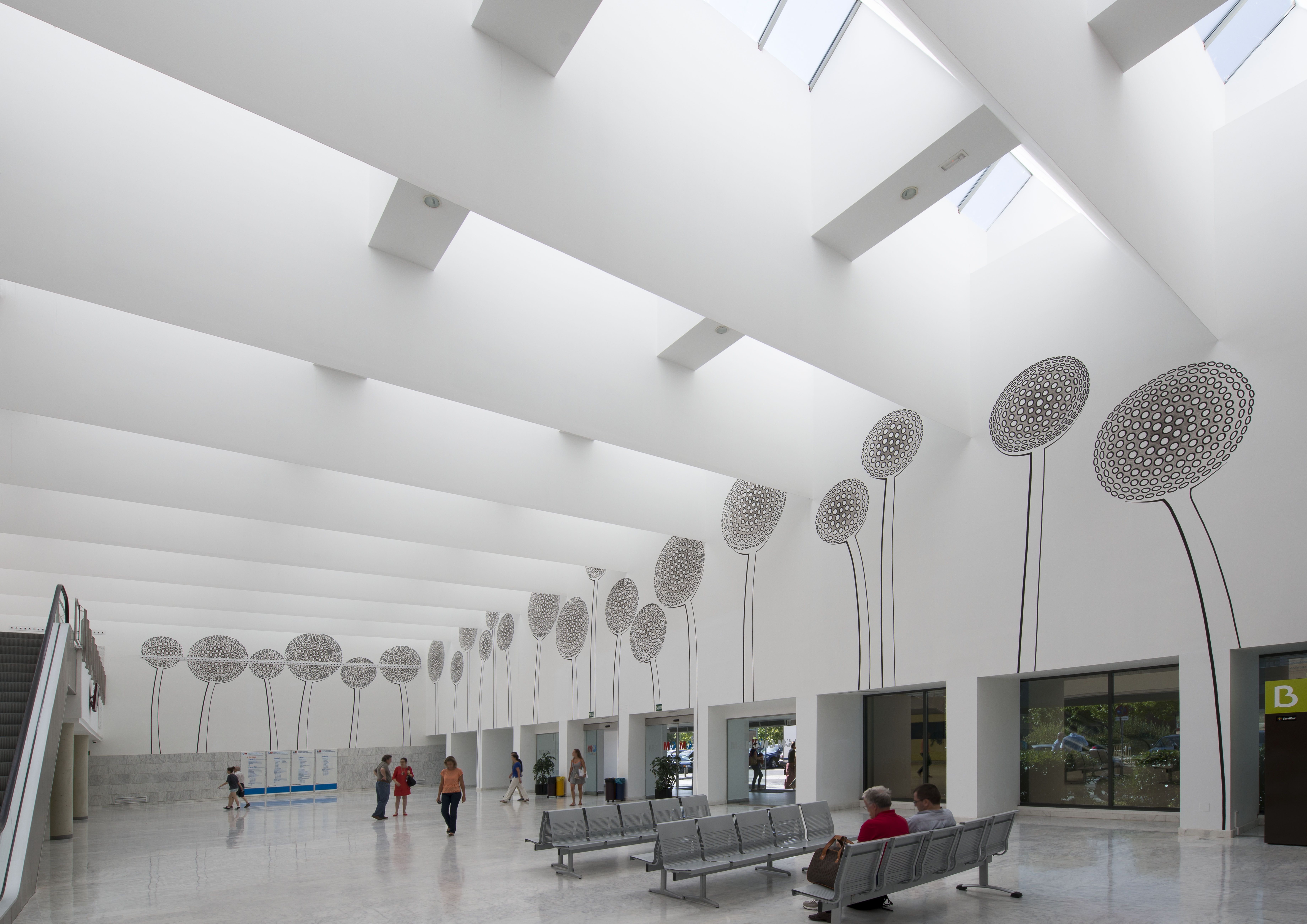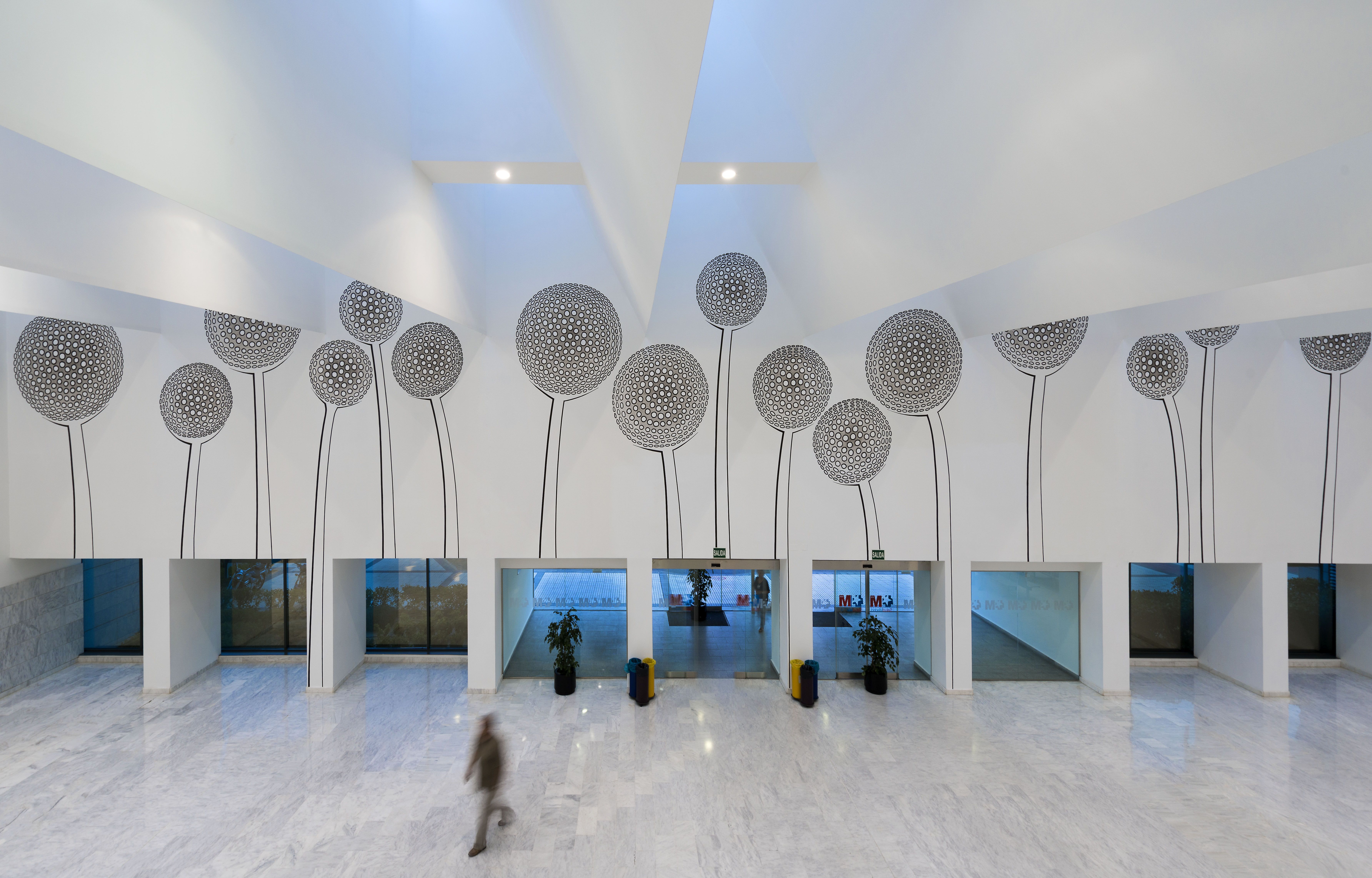 El punto de partida ha sido convertir esta plaza interior en un jardín. La naturaleza dentro del edificio, a modo de delicadas estructuras que semejan flores oscilando suavemente con el viento (en este caso el viento es la luz) que va a hacer que cambien a lo largo del día.