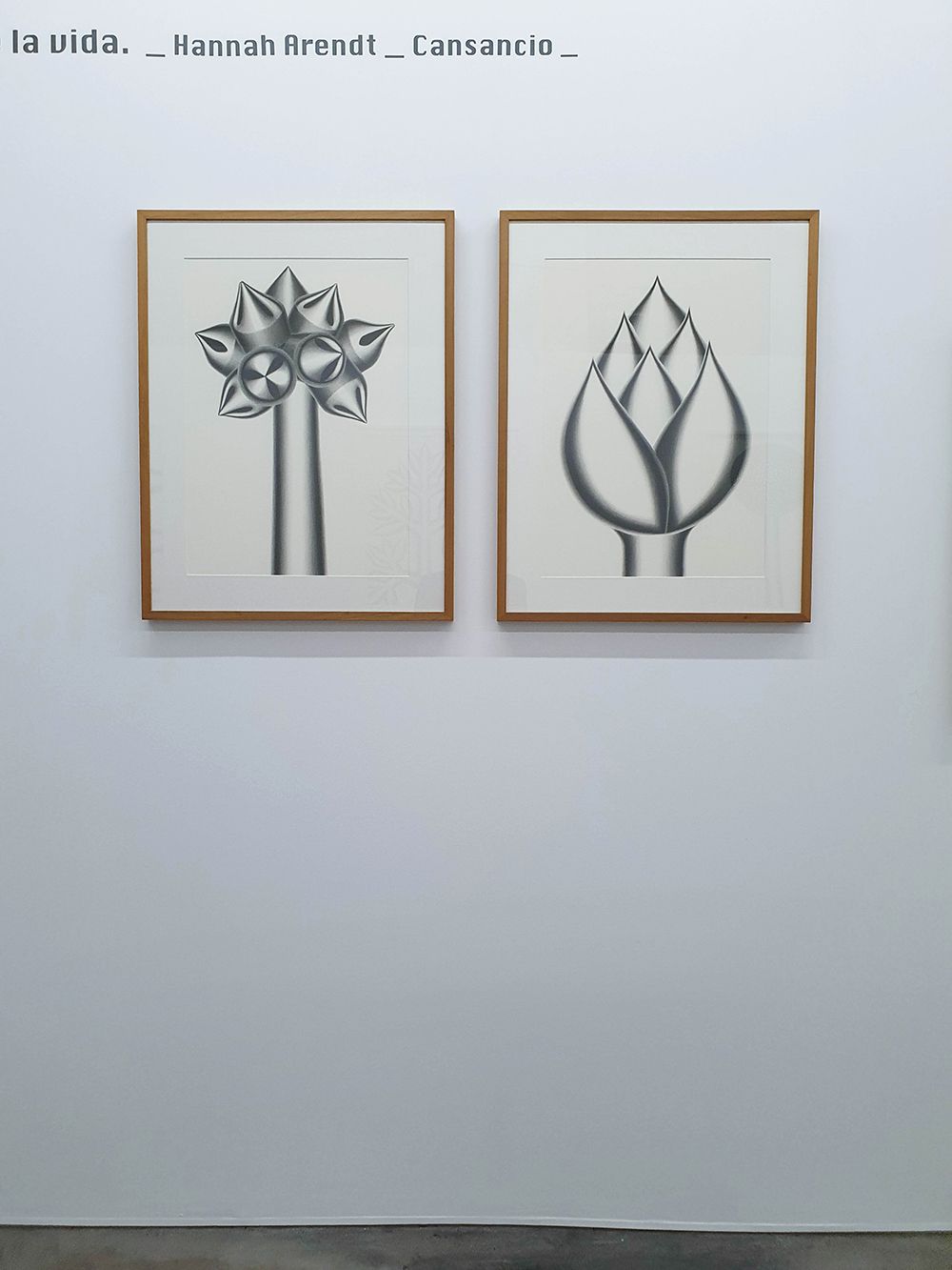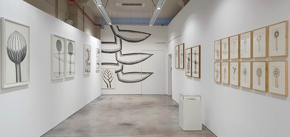 La muestra reúne una serie de grafitos de gran formato y una docena de pequeñas y delicadas puntas de plata. El recorrido del montaje, relacionado sobre el eje central de un gran mural, invita a una visión sosegada de las obras y a adoptar, elevando y bajando la mirada, una posición dual, la de espectador y, al tiempo, experimentar la sensación de la artista en su pausado y preciso trabajo, "inhalar, exhalar, controlar la respiración, elevar la mirada, reflexionar sobre el último trazo, volver sobre el papel...", como en el mismo acto del proceso de dibujo.