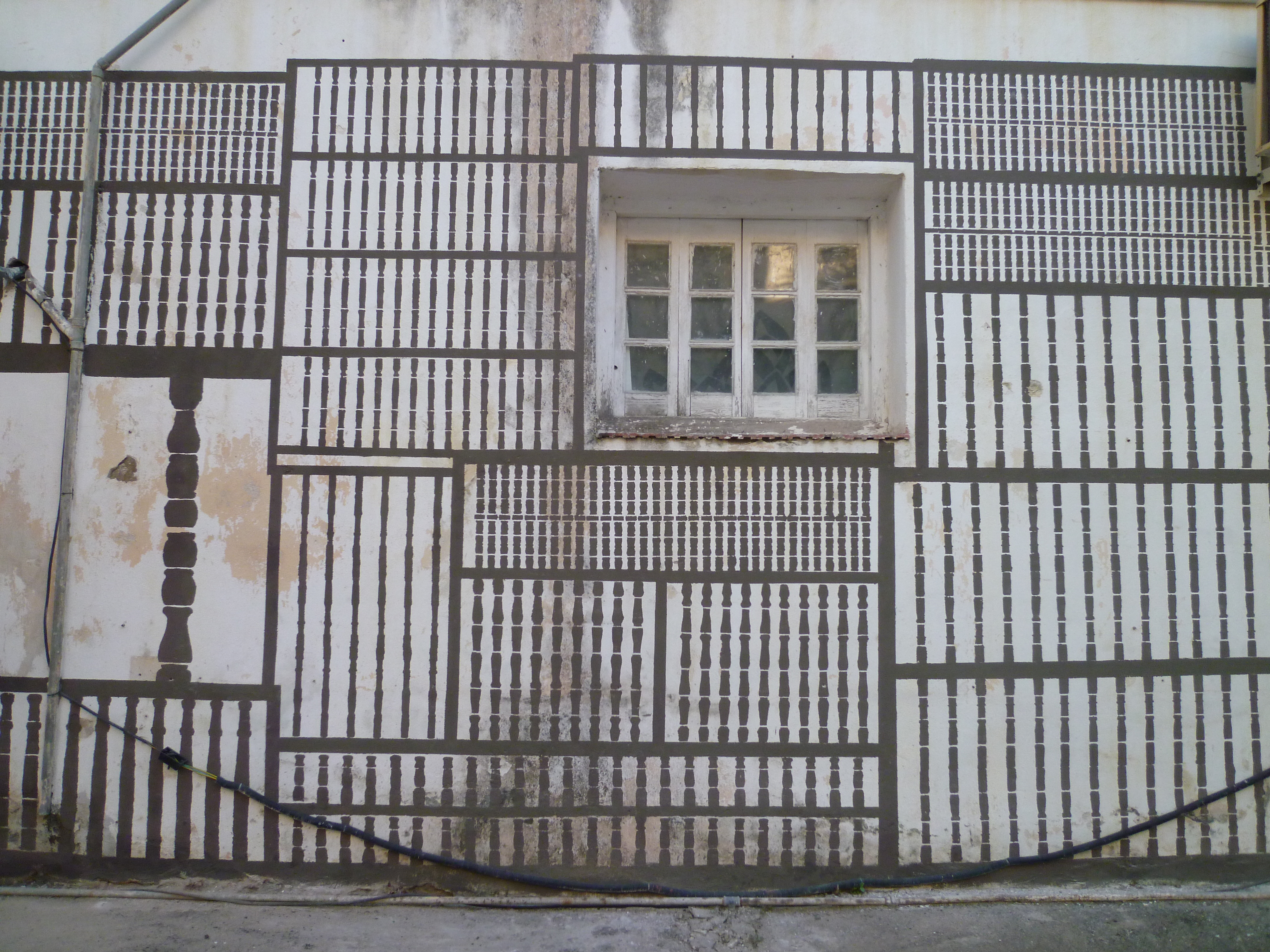 En la parte exterior del muro que linda entre la sala interior y el patio ha realizado una de sus habituales intervenciones site specific. En este caso, partiendo de la combinación de barrotes, balaustres y barandillas de madera de edificios históricos, construye la sombra de una pequeña jungla culturizada en la que se entrelazan diferentes tipologías que "crecen" y enraman a lo largo y ancho de la superficie, como un cañaveral vertical o una enredadera trepadora.
